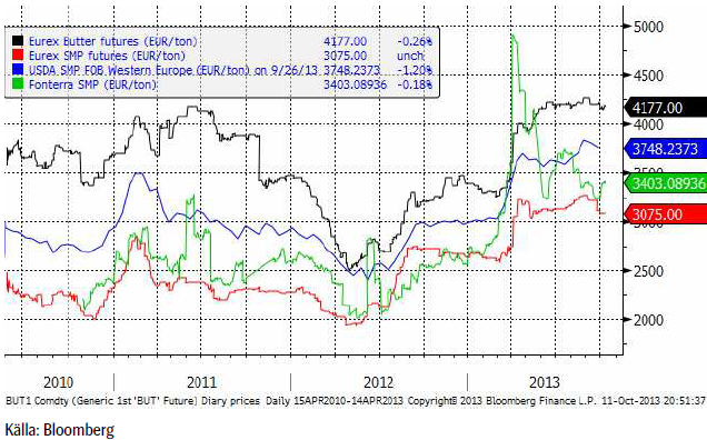 Terminerna på smör och skummjölkspulver vid Eurex-börsen var stabila och rörde sig inte mycket under veckan som gick. Fonterras pris steg något, efter det kraftiga prisfall från toppen som varit.