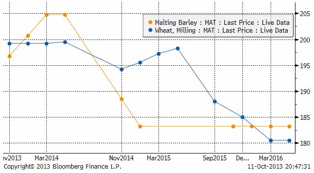 Som vi ser av diagrammet nedan, ligger novembers maltkornskontrakt under vetet, men januari, mars och maj ligger alla över. Det indikerar ett ”överutbud” av maltkorn just nu och / eller en brist på kvarnvete.