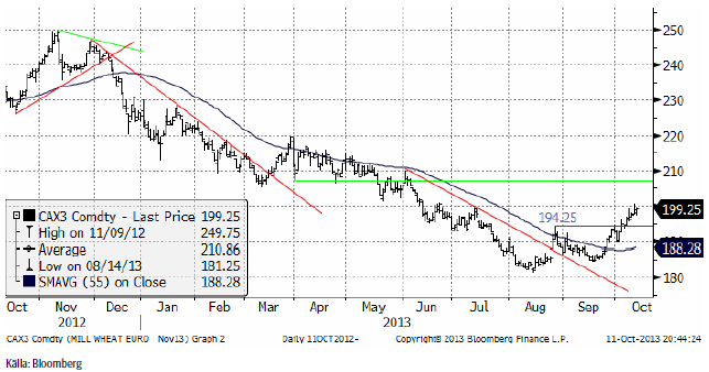 November månads terminskontrakt på Matif har gått upp mot 200 euro, ett tekniskt motstånd. Det har varit en god uppgång och många kommer att vilja sälja till 200 euro. Vi gissar en det kommer en rekyl nedåt den här veckan, vilket vi tror är ett köptillfälle.