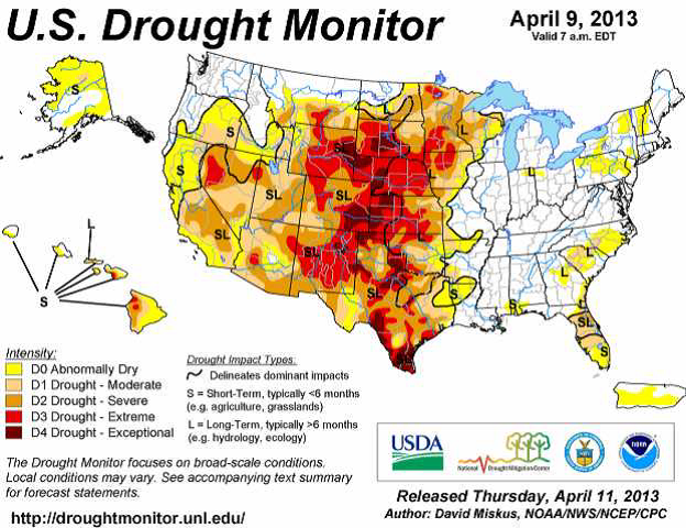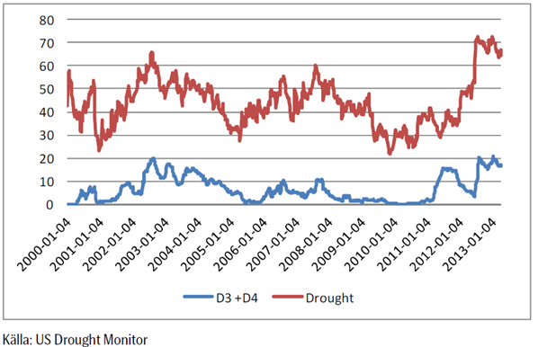 Vi ser att torkan har försvunnit nästan helt från östra halvan av USA. För USA som helhet är fortfarande 66% torrare än normalt eller torkdrabbat. Andelen av USA som är drabbat av de två mest extrema formerna av torka ligger kvar på strax under 20%.