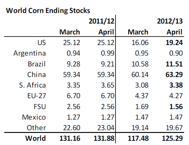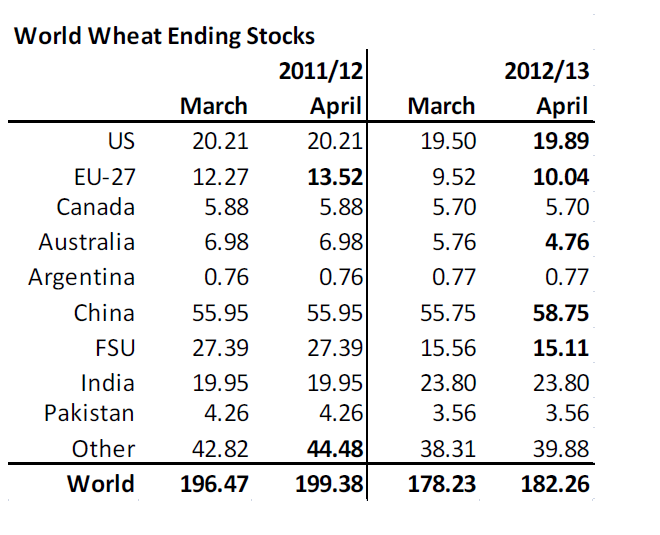 Globala utgående lager höjdes 8 mt från 117.48 mt av USDA. Av det ligger 3 i USA och 3 i Kina. I USA är det lägre foderefterfrågan men högre etanolefterfrågan. I Kina har vi ingen aning om vad det är som ligger bakom, egentligen. Vi kan notera att av ökningen i vete+majs-lager står Kina för en betydande del. Det är möjligt att detta är rimligt, med tanke på vilka effekter som fågelinfluensan kan få i framtiden för foderefterfrågan, men lager i Kina lär i vart fall inte komma ut på världsmarknaden om de skulle behövas.