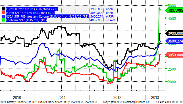 I kursdiagrammet nedan ser vi priserna på Fonterras SMP, USDA:s prisnotering på SMP i Europa och Eurexbörsens pris, samt Eurex pris på smör. Alla priser är angivna i euro per ton.