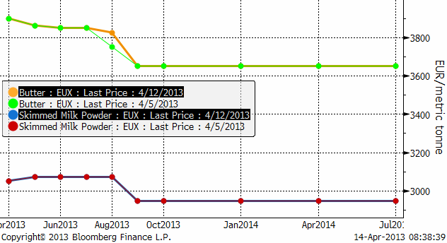 Nedan ser vi terminskurvorna för smör och skummjölkspulver på Eurex.