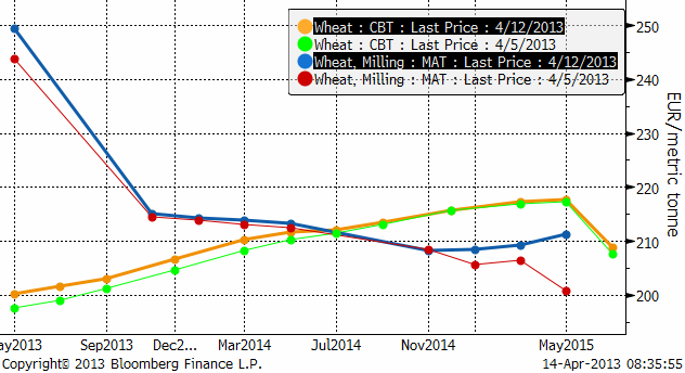 Terminskurvorna visar högre priser för gammal skörd den senaste veckan (fredag till fredag). De längre terminskontrakten har inte förändrats prismässigt alls.