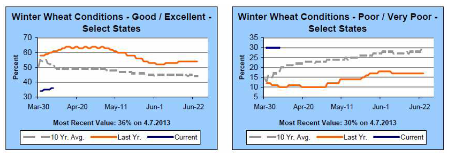 Priset på november (2013) föll omedelbart från 220 euro ner till under 210 euro när lagerstatistiken publicerades av USDA för två veckor sedan. Efter att marknaden hade stirrat sig blind på lagerstatistiken hade man inte tänkt på att crop condition skulle rapporteras igen efter vinteruppehållet på annandag Påsk.