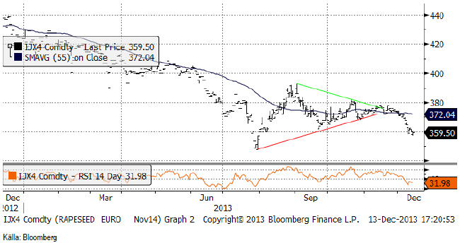 Tekniskt stängde Matif precis på stödet för uppgången från början av augusti. Eftersom Chicagovetet i fredags gick under stödet på 664 cent (basis Dec 2014-kontraktet), skulle det inte förvåna om Matif bröt stödet och inledde en rekyl nedåt. November 2014-kontraktet låg i fredags på 192.75 och om stödet bryts finns nästa stöd på 185 euro. Vi skulle tro att priset går dit. Eventuellt finns stöd på 190, där priset kan studsa som hastigast.