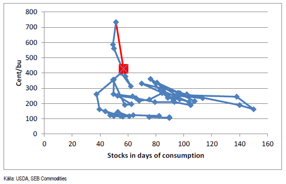 USDA sänker utgående lager med 2 mt, därför att man räknar med högre foderefterfrågan i EU-28, Kanada, Ukraina och högre efterfrågan på majs till etanoltillverkning i USA. Detta verkar rimligt med tanke på boomen i kött och mjölkpriser. Det är nog en trend vi kommer att se mer höjningar i konsumtionen för. Men vi tror inte att höjningen av efterfrågan på majs till etanolindustrin är långsiktigt hållbar. Kina har dessutom satt en båtlast med DDG (drank) från USA i karantän därför att man misstänker att den innehåller GMO-vara av en sort som är förbjuden i Kina. Skulle DDG-exporten till Kina stanna av, skulle ekonomin i etanoltillverkningen försämras, allt annat lika.