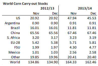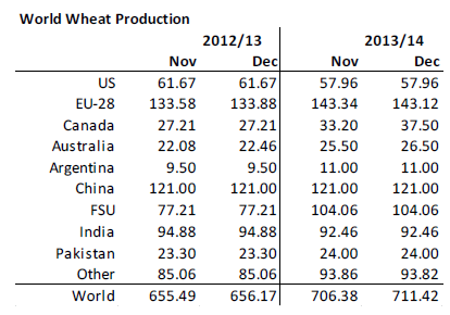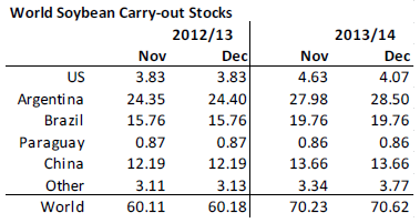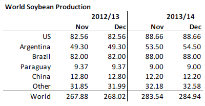 I tisdags kom så årets sista WASDE-rapport från USDA. USDA fick med och tog till sig de nya högre produktionsestimaten från veckan innan från Kanada (37.5 mt) och Australien (26.5), men gjorde inte det för Argentina, där USDA fortfarande har 11 mt. Det står ju helt klart att Argentinas produktionsestimat är lågt därför att det då begränsar exporten till 1.5 mt och inte 4 mt som det hade varit om de hade sagt 11 mt. Sammantaget justeras alltså global produktion 2013/14 upp med 5 mt till 711.42 mt.