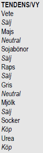 Vi tror det kommer en period med lite svagare marknad nu, med en mindre nedgång i terminerna på vete. På ett lite längre perspektiv är vi mer eller mindre neutrala, men på kort sikt går vi över från neutral till säljrekommendation.
