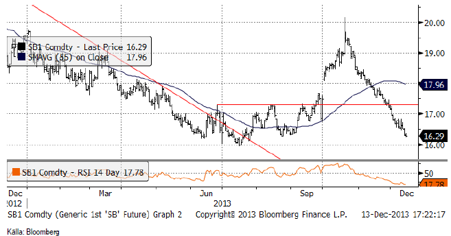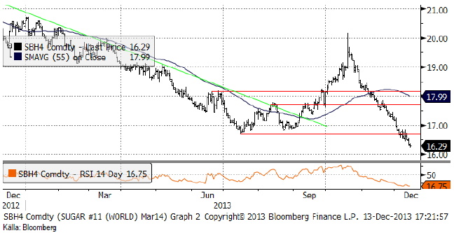 Marskontraktet på råsocker har till vår stora besvikelse fortsatt att falla till kontraktslägsta på 16.29 cent per pund i marskontraktet. RSI ligger på en ny lägsta nivå om 16.75. En nivå under 30 brukar anses indikera en ”översåld” marknad och en nära förestående rekyl. En så här lång period av rekylfri nedgång är mycket ovanlig och kan bara förklaras av att många måste ha trott på en rekyl uppåt tidigare, liksom vi, och successivt tagit stoppar. Det är svårt att resonera här, för trots att priset faller, så byggs potentialen i rekylen uppåt upp allt mer, ju mer priset faller. Å andra sidan föll priset under det tekniska stödet på 16.60, vilket indikerar ytterligare svaghet i marknaden.
