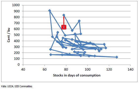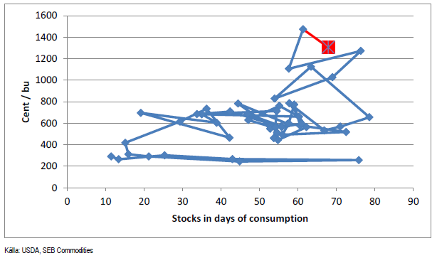 Ser vi till prisets relation till utgående lager, ligger priset möjligtvis något lågt om vi jämför med den allmänna bilden som förhållandet mellan pris och lager de senaste åren ger. Å andra sidan kan vi jämföra med punkten för fem år sedan, när priset var 100 cent lägre för nästan samma nivå på lagret. Det är alltså svårt att dra några entydiga slutsatser om priset just nu är för ”högt” eller för ”lågt”.