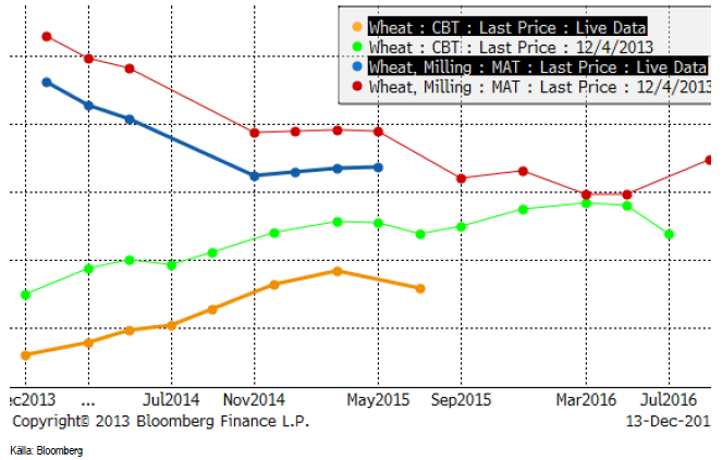 Nedan ser vi terminskurvorna för Chicagovete och Matif.