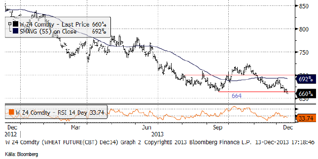 Decemberkontraktet 2014 på CBOT som föll tillbaka ner mot det tekniska stödet, efter ABARES och Stats Canadas rapporter, bröt igenom stödet på 664 i fredags. Det är en teknisk säljsignal.