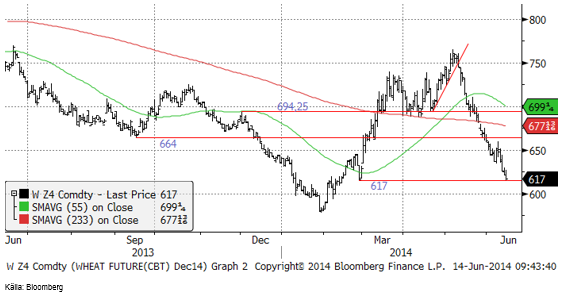 Chicagovetet (december), stängde i fredags exakt på den tekniska stödnivån 617 cent. Vid en sådan nivå kan det bli en rekyl uppåt, och det skulle inte förvåna om detta inträffar.