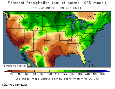 I USA har förra veckans 14-dagarsprognos slagit om till torr igen för Texas, Oklahoma och Texas. Det passar faktiskt ganska bra, eftersom det är dags att skörda där. Det är fortfarande mer nederbörd än normalt i majsbältet.