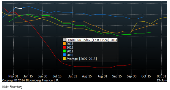 Sådden av majs i USA är klar sedan ett par veckor. Nu har crop condition börjat rapporteras för majs. 75% var i good/excellent condition per den 6 juni. Det är i princip på samma nivå som år 2010. Corn yield estimerades då som högst på 165 bushels per acre, men blev slutligen 152.8. 2010 var året då torkan slog till i juni och lämnade majsen mer eller mindre död på många fält. I den senaste WASDE-rapporten från i onsdags behöll USDA estimatet från Outlook Forum i februari på 165.3 bushels per acre. Än så länge är vädret så bra, att det som hände för fyra år sedan knappast kommer att ske.