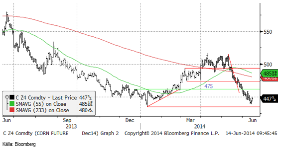 Decemberkontraktet på majs föll i torsdags ner mot den tekniska stödnivån som angavs att bottennoteringen i januari. Det är naturligt att det finns köpare där. Priset vände upp och stängde i fredags nära dagshögsta på 447.5 cent. Det är möjligt att vi får se lite ”sidledes” rörelse i kursdiagrammet nu.