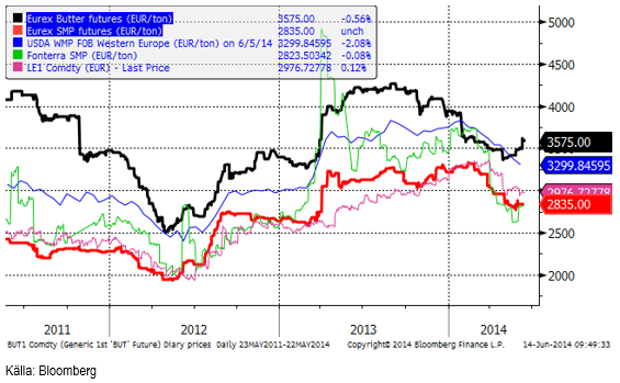 Priset på smörterminerna på Eurex fortsätter att återhämta sig efter det senaste årets ganska kraftiga prisfall på nästan 25% från topp till botten. Terminspriset på SMP ligger dock kvar, men så började prisfallet i SMP ungefär ett halvår efter prisfallet i smör. Priset på SMP har inte heller backat lika mycket som smörpriset.