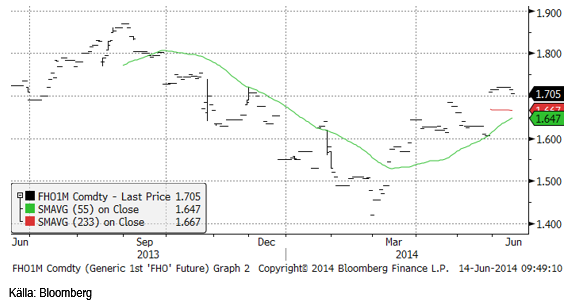 Vi får se hur vädret fortsätter att utveckla sig i norra Europa under sommaren. Om det fortsätter att bli allt torrare, finns möjligheten att få en rejäl uppgång i priset.