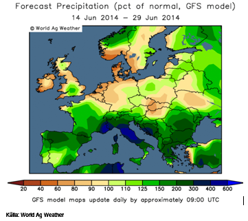 Europa håller på att torka upp inför skörden, vilket vi ser av prognosbilden för avvikelsen från normal nederbörd under perioden 14 juni – 29 juni nedan.