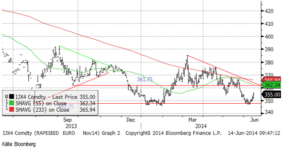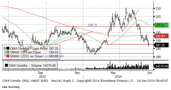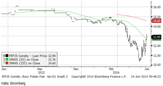 Efter att ha varit nere på nästan 10 euro per deciton har marknaden återhämtat sig betydligt. Detta hänger ihop med den mycket torrare väderleksprognosen för norra Europa. Prisuppgången bör kunna fortsätta till mellan 14 och 15 euro, där det finns ett tekniskt motstånd – säkerligen en nivå som lantbrukare gärna skulle vilja säkra priset på efter vårens skräckresa ner mot 10 euro.