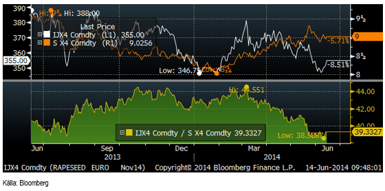 En faktor som ger stöd för rapspriset är att det fallit ganska kraftigt i förhållande till sojabönorna. Nedan ser vi kvoten mellan novemberkontraktet på rapsfrö på Matif och novemberkontraktet på sojabönor på CME, omräknat till euro. Vi ser att kvoten ligger mycket lägre än tidigare. För att rapspriset ska gå mycket lägre, måste sojabönorna också (börja) gå ner i pris.