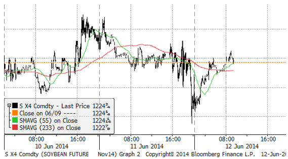 Priset på sojabönor har tenderat att handlas ner på dagen och handlas upp igen på kvällen / natten. Marknaden verkar ha ett bra stöd vid 1200 cent. Skulle det brytas, finns nästa stöd vid 1150 och under det, vid 1100 cent.