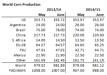 USDA höjde global produktion med 4.6 mt i juni månads WASDE-rapport. Det är en större höjning än vad FAO/AMIS gjorde förra veckan. USDA ökar estimatet för veteproduktionen i EU med 1.5 mt, i Kina med 1 mt och i fd Sovjetunionen med 1 mt. En liten minskning gjordes för produktionen i USA. Sänkningen var helt beroende på ett lägre avkastningsestimet. Skörden per acre sänktes från 42.7 till 42.3 bushels. Arealen hölls oförändrad på samma nivå som angavs vid Prospective Plantingsrapporten den 31 mars.