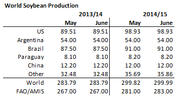 USDA höjde ”crushing” i USA, vilket innebar att utgående lager sänktes lite för USA. I övrigt gjordes små förändringar, som ändå sammantaget innebar 0.5 mt högre utgående lager 2014/15, delvis beroende på att utgående lager för 2013/14 justerades upp med ett par hundra tusen ton. Förmodligen kommer det att komma mer höjningar av utgående lager i kommande WASDE-rapporter.