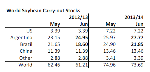 På grund av sänkningen för årets skörd i Brasilien, sänkte USDA ingående lager i 2013/14 och eftersom man inte gjorde några större förändringar för konsumtionen heller på global basis, resulterade detta i lägre utgående lager.