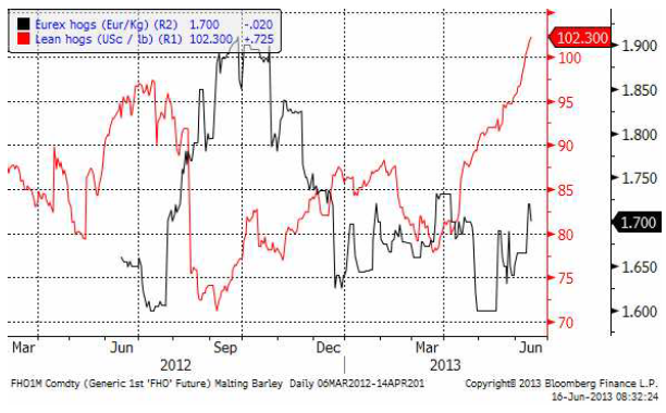 De tyska grisarna har hängt på och gått från 1.665 euro per kilo till 1.70 euro per kilo.