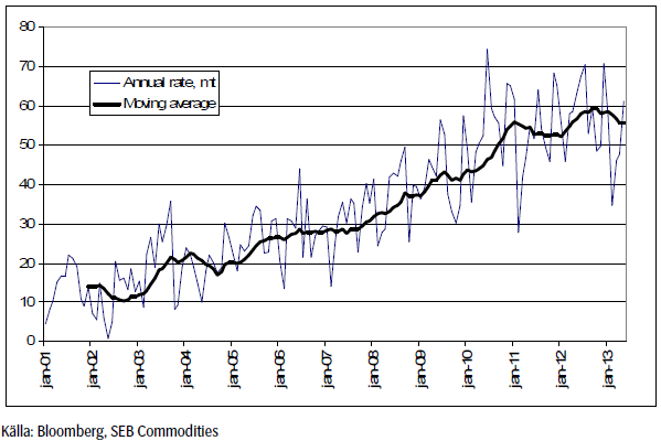 En anledning till lageruppbyggnaden är att Brasilien svarat på det höga priset och producerat mycket mer sojabönor. En annan anledning är att kinas glupande aptit efter mer, har mättats. Nedan ser vi importstatistik på månadsbasis. Månadssiffrorna är omräknade till årstakt. Vi ser också ett glidande årsmedelvärde. Bilden visar att efterfrågeökningen har planat ut.
