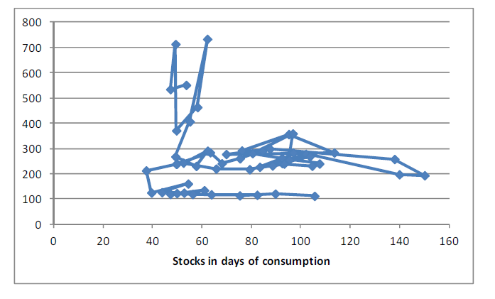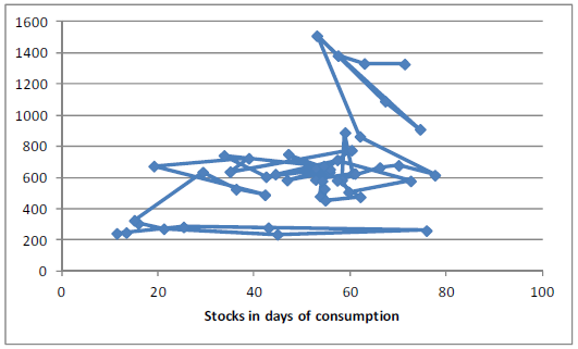 Nedan ser vi relationen mellan lager (på x-axeln) och pris. Varje punkt är läget i juni varje år sedan år 1960. Läget just nu ligger precis mitt emellan 700 cent och 400 cent. Man kan alltså motivera både ett mycket högre pris och ett mycket lägre. Vilket det blir beror på hur odlingsvädret utvecklar sig fram till skörd.