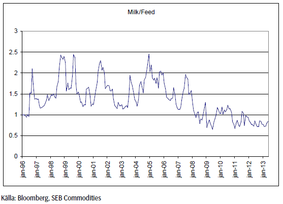 Liksom fallet är med griskött, har fallet i relationen mellan mjölkpris och foderkostnad (80% majs, 20% sojamjöl) legat på en dålig nivå sedan 2008. Om mjölkpriset fortsätter hålla sig och spannmålspriset fortsätter att falla, kommer detta att leda till förbättringar i lönsamheten.