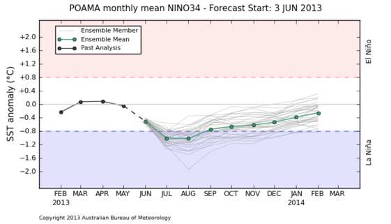 Som vi ser höll sig prognosen säkert över La Niña-gränsen för en månad sedan. I den senaste prognosen, som vi ser nedan, prognosticeras nu La Niña-förhållanden under juli och augusti.