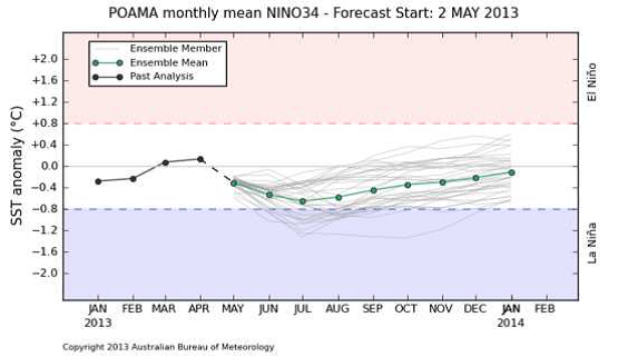 Vi tycker det är viktigast att upplysa om att ett La Niña helt oväntat kommit in i ensemble-prognosen från Australiens meteorologiska byrå. Detta har potential att ställa till med torka igen i USA och Ryssland senare i år.