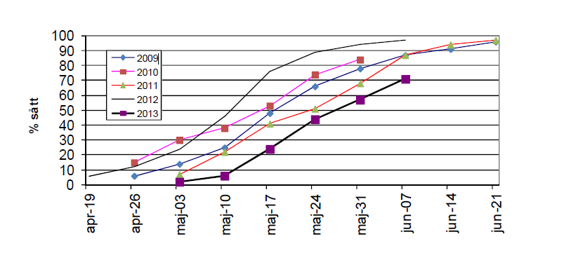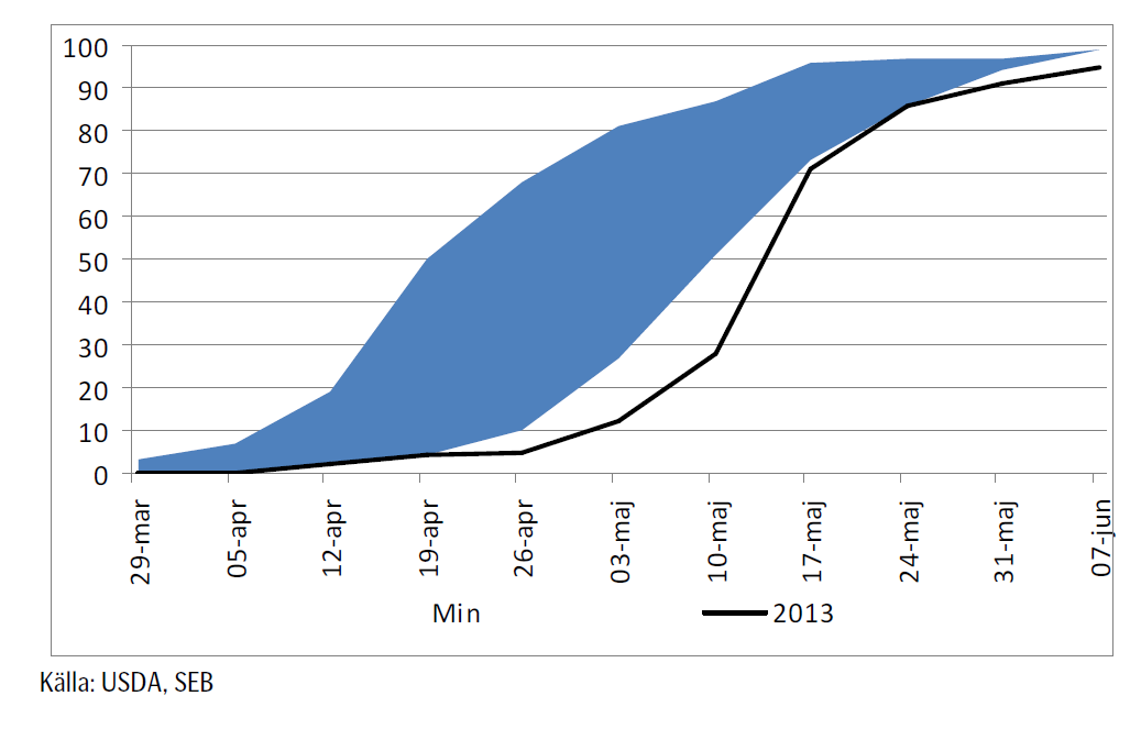 Till förra helgen hade amerikanska lantbrukare lyckats ta sig till 95% sått. Crop condition är 63% i good eller excellent-kategori. Nedan ser vi årets sista diagram på såddens fortskridande i USA.