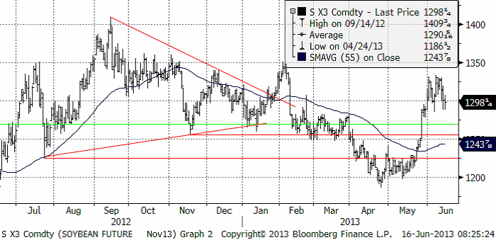Sojabönornas prisuppgång stannade av och WASDE-rapporten från USDA fick marknaden på fall i onsdags. En rekyl ned mot 1250 skulle kunna vara förestående.