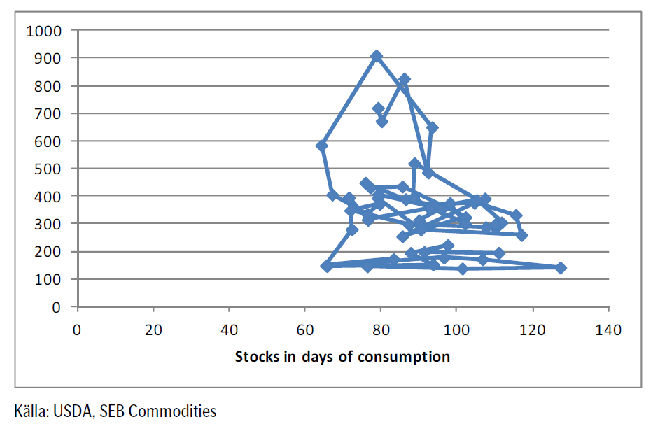 Nedan ser vi relationen per juni för utgående lager och pris i historiskt perspektiv. Vi ser att ett pris på strax under 1400 cent per bushel och ett utgående lager på över 70 dagar, är ett abnormt högt pris. Ett pris kring 1000 cent vore mer i linje med den historiska relationen.