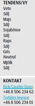 Utbudet av spannmål, framförallt då majs, kommer att öka stort. Regnen i Europa ökar utbudet av den dåliga Matif-kvaliteten och det gör att vi ligger kvar med säljrekommendation på detta, trots att priset kommit ner så pass att det går att motivera ”neutral” rekommendation på dessa priser också.