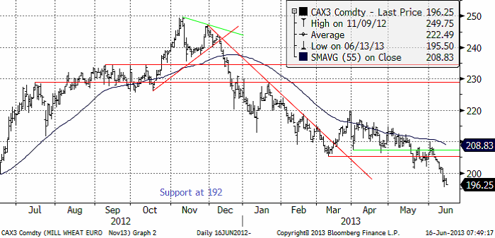 Decemberkontraktet på CBOT stängde i fredags på 701.50 cent per bushel. Det är precis ovanför det starka stödet på 700 cent. Skulle det brytas, t ex i veckan som kommer, signaleras ytterligare nedgång i terminspriset.