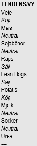Bryts det tekniska motståndet i veckan som kommer, signaleras att den fallande pristrenden är bruten. Vädret i Ryssland / Ukraina är gynnsamt för odlingen där, liksom vädret i USA. Fundamentalt sett borde priset gå ner, men på kort sikt skulle ett krig mellan Ryssland och Ukraina driva upp priset. Vi fortsätter med neutral rekommendation, men med rekommendationen att köpa om 380 cent bryts för CZ4.