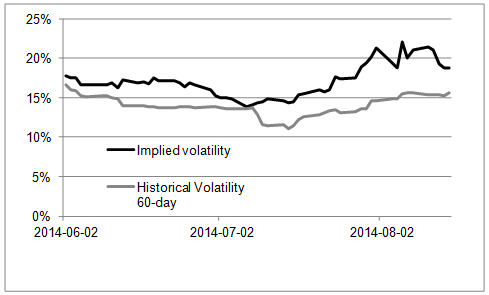 Optionsmarknaden prissätter optioner till lägre implicit volatilitet efter WASDE-rapporten. Den handlade volatiliteten har minskat från 21% till 19% sedan i tisdags.
