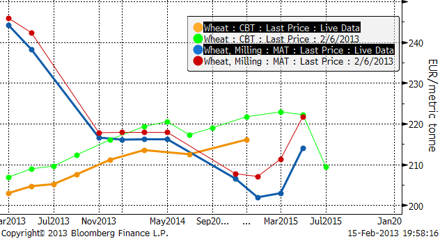 Mellan augusti 2012 och januari 2013 steg det lokala vetepriset från 2169 RMB till 2360 RMB per ton, en ökning med 9 procent, vilket enligt FAS skulle kunna vara en stark indikation på att veteproduktionen och det totala tillgängliga utbudet är lägre än de kinesiska officiella produktionsestimaten. Nedan ser vi priset på spotkontraktet på Matif och Ex-warehouse vetepris i Shanghai, också i euro per ton (omräknat).