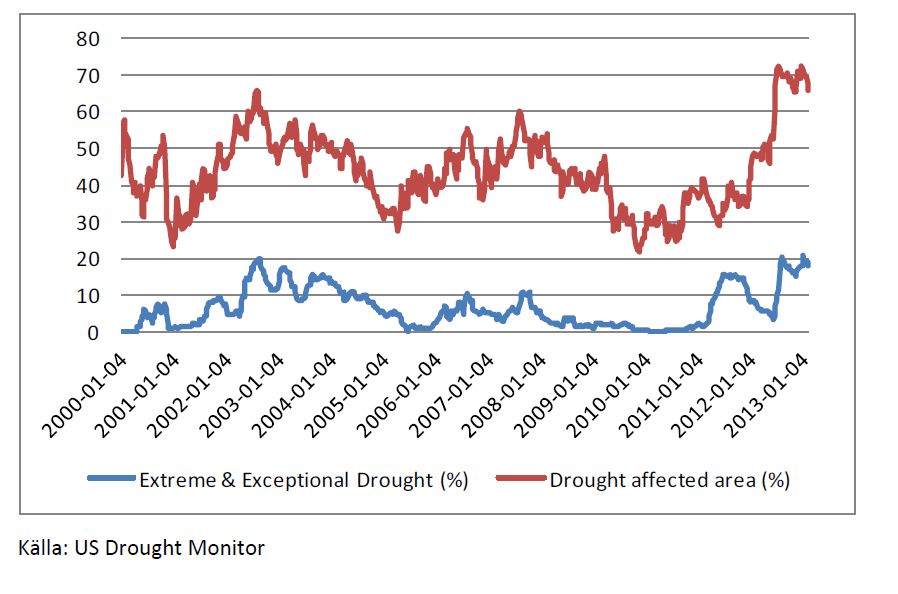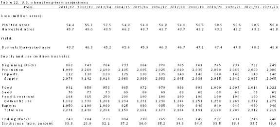 Det amerikanska jordbruksdepartementet USDA kom ut med sin långtidsprognos nu i veckan som sträcker sig fram till 2022. Prognosen för vete 2013/14 visar en ökning med 3% på årsbasis för sådd areal till 57.5 miljoner acres, vilket är den högsta nivån sedan 2009, men under de kommande åren förväntas sådd areal att fortsätta den historiska nedgången. Skördad areal förväntas hamna på 48.5 miljoner acres, vilket är 3% lägre än under 2012 som en följd av grödornas dåliga tillstånd. Långtidsprognosen innehöll också USDA’s första prognos för 2013 års veteproduktion som förväntas uppgå till 2,190 mb, vilket är en minskning med 79 mb jämfört med 2012, men den största produktionen under prognosperioden fram till 2022. Den genomsnittliga avkastningen 2013 beräknas uppgå till 45.2 bu/acre, och förväntas därefter att öka stadigt under åren för att 2022 uppgå till 48.6 bu/acre. Prognosen för ingående lager av vete per den 1 juni 2014 är satt till 733 mb, jämfört med estimatet för 2013 som ligger på 704 mb. Ingående lager 2015 förväntas uppgå till 804 mb, vilket skulle vara den högsta nivån under hela prognosperioden.