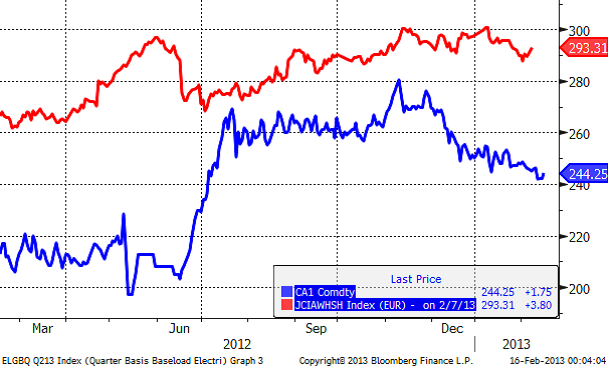 Priset på november (2013) kontraktet slutade 1% lägre än förra veckan, efter att ha börjat med ett kraftigt prisfall ner till 210 euro innan rekylen uppåt kom. 210 euro är ett tekniskt stöd. Bryts detta på uppsidan i veckan som kommer, är prisfallet från början av december troligen hejdat för ett tag framöver. Men det mest sannolika är att priset vänder ner igen för ett nytt test av 210-nivån.