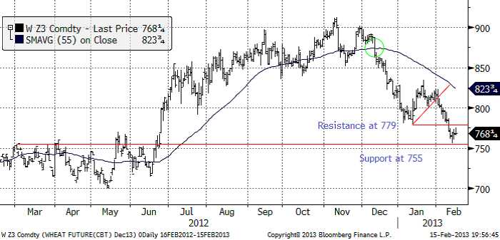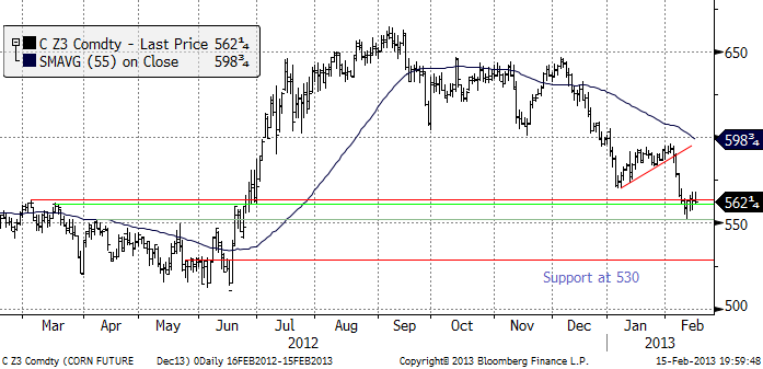 Majspriset (december 2013) nådde 550 cent, vilket var det ”mål” vi nämnde för ett par veckor sedan. Vi tror att den rekyl vi såg mot slutet av veckan är en så teknisk så kallad ”flagga” och att priset kommer att vända ner igen. Nästa stöd finns på 530 cent. Dit tror vi att priset går.