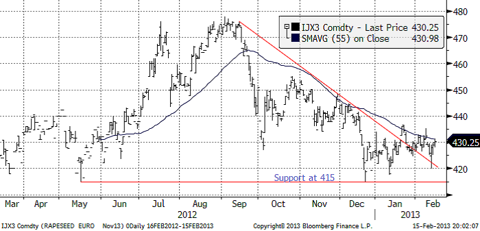 Rapspriset (november 2013) har fortsatt att röra sig ”sidledes” med ganska tvära kast. Det verkar finnas fyndköpare på 420 euro per ton. Det verkar också finnas en hel del spridda säljintressen kring 430 euro.