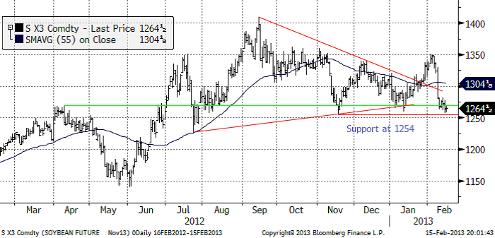Sojabönorna (november 2013) fortsatte att röra sig nedåt, efter det stora prisfallet när WASDE-rapporten publicerades. 1254 cent är ett viktigt stöd. Bryts det kan prisfallet bli stort.