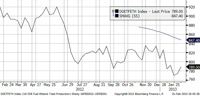 Veckovis etanolproduktion i USA har hämtat sig sedan den 25 januari när den nådde den rekordlåga nivån 770,000 fat / dag.